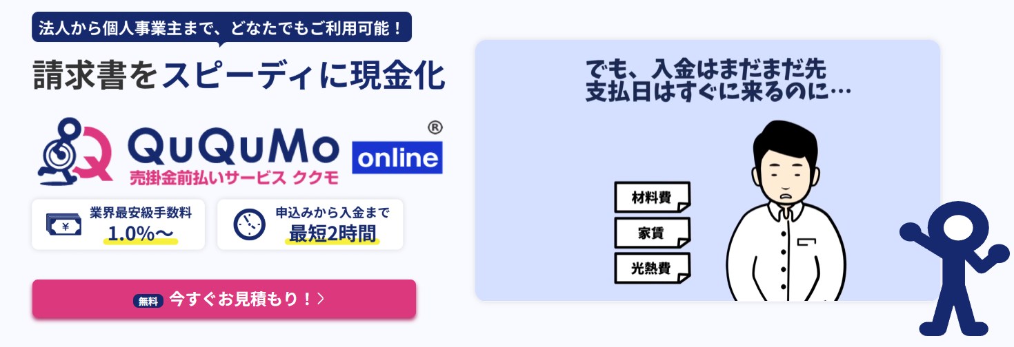 QuQuMo(ククモ)は、最短2時間の入金スピードと**業界最低水準の手数料1%~**を実現したオンライン完結型のファクタリングサービスです。